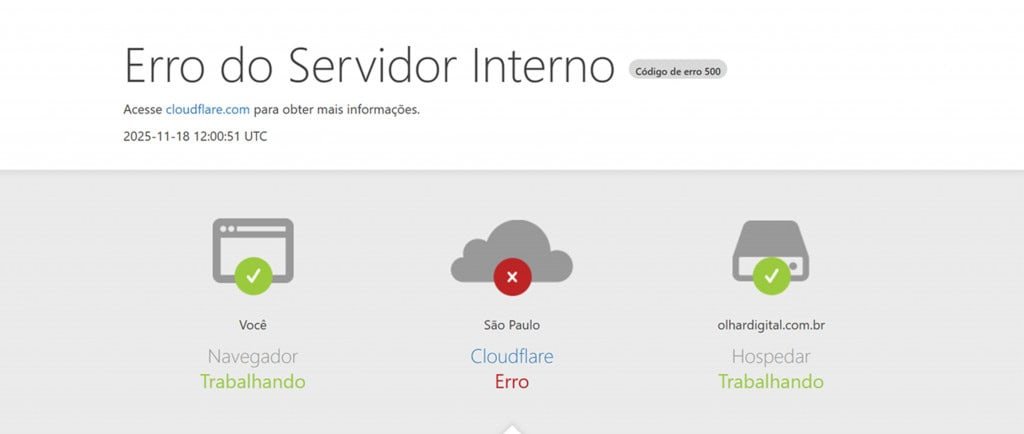 Um problema técnico na Cloudflare deixou partes da internet fora do ar na manhã desta terça-feira (18). Sites como ChatGPT, X (antigo